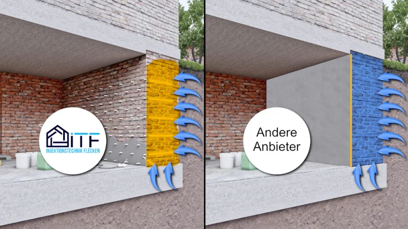 Durch eine unzureichende, fehlenden oder defekten Außenabdichtung gelängt Feuchtigkeit durch die Außenwand. Eine nachträgliche Abdichtung verhindert das flächig Feuchtigkeit, bzw. Wasser ins Innere gelangt.